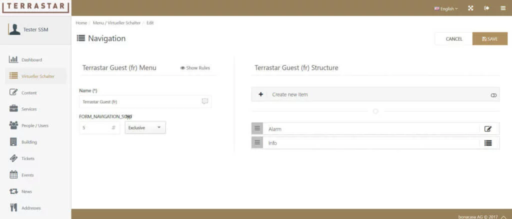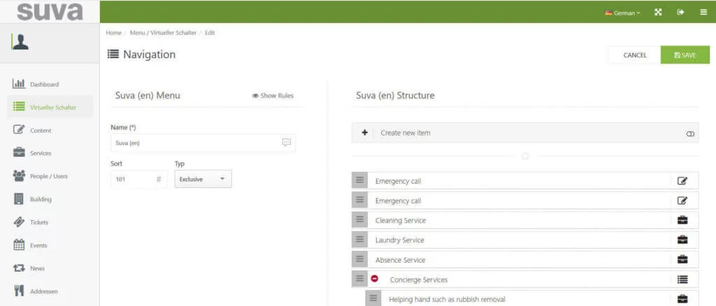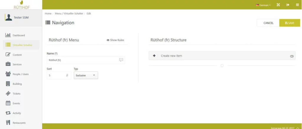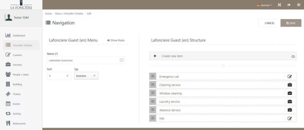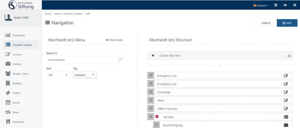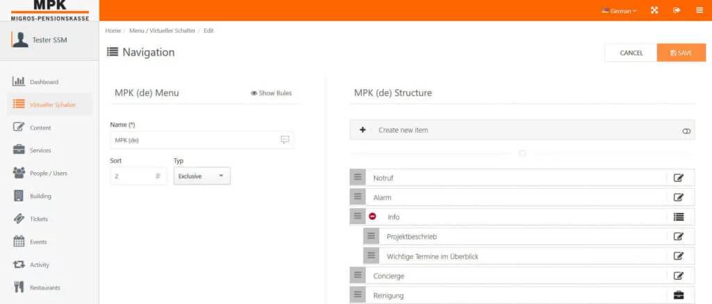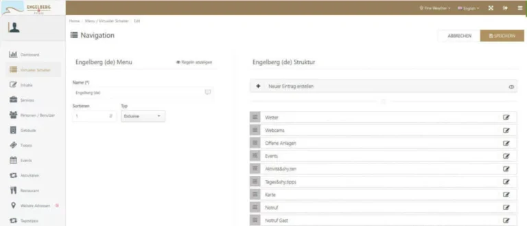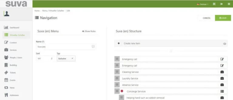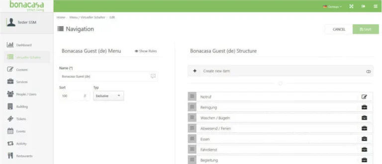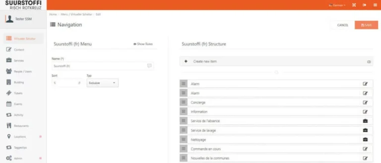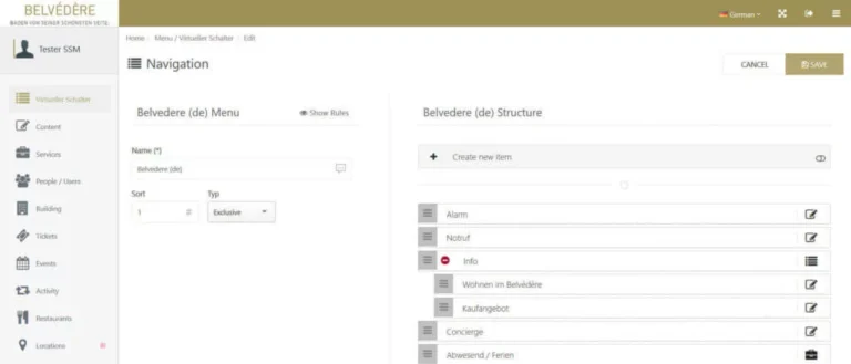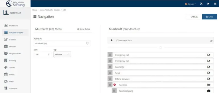 Über das CMS können die Inhalte der App administriert werden, es braucht dabei kein Update der App. Die Hauptnavigation der App kann dabei so angepasst werden, dass je nach User-Profil andere App- Inhalte angezeigt werden können. Für Serviceleistungen welche über die App bestellt werden, wird direkt im CMS ein Ticket erstellt und kann von da weiterverarbeitet werden.